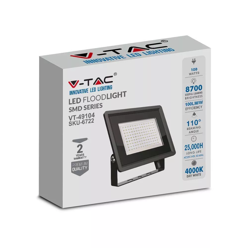 V-TAC 100W LED reflektor 100° 4000K fekete házas E széria - 6722
