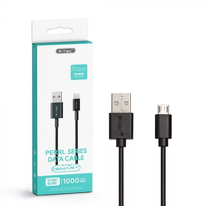 V-TAC 1M Micro USB kábel fekete - gyöngy széria - 8481