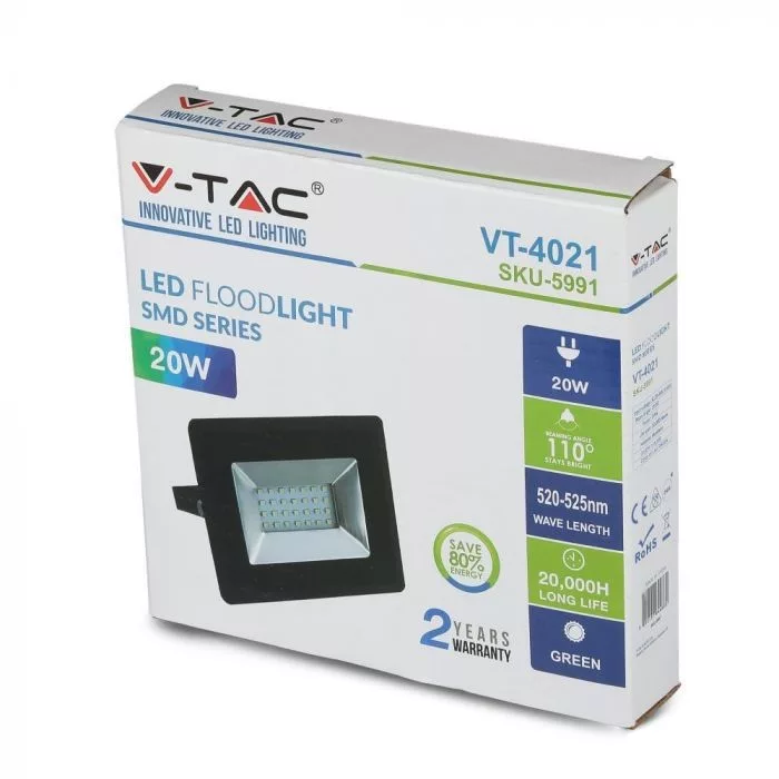 V-TAC 20W LED reflektor E-széria 110° zöld fényű, fekete házas - 5991