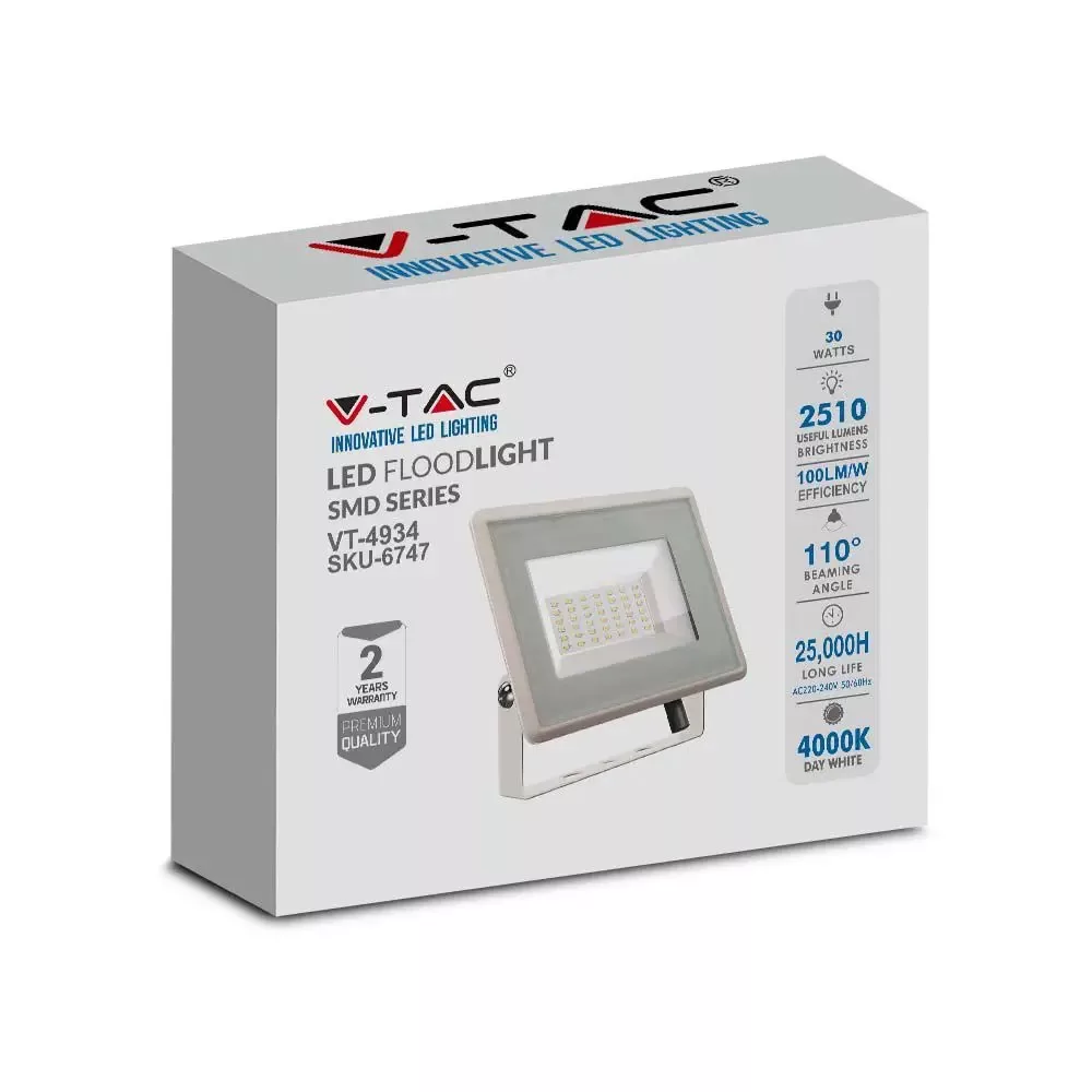 V-TAC 30W LED reflektor 100° 3000K fehér házas E széria - 6746