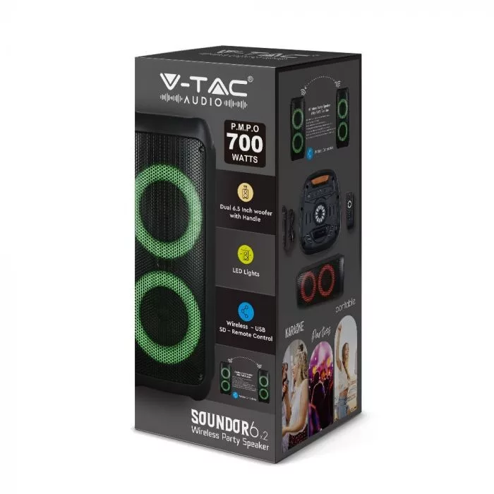V-TAC 35W Tölthető party hangfal, vezetékes mikrofon, RF távirányítás, Bluetooth RGB 2*6.5 inch - 8981