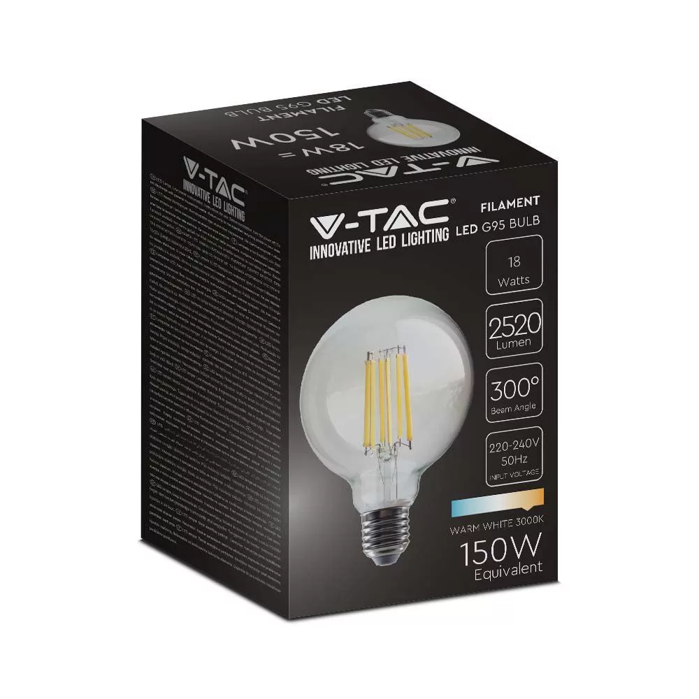 V-TAC Átlátszó LED izzó filament COG  E27 G95 18W 3000K nagygömb - 212803