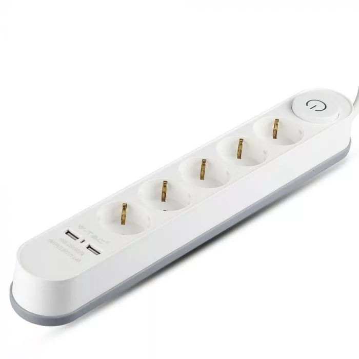 V-TAC Hosszabbító kapcsolóval 5 csatlakozós + 2 db USB port, 3 m fehér - 8807