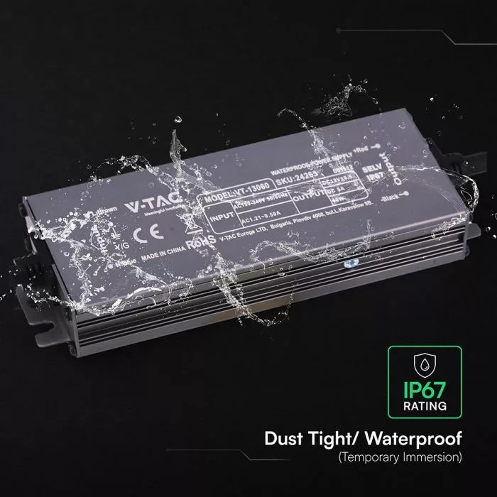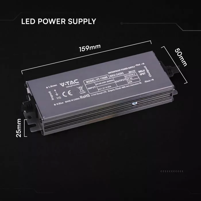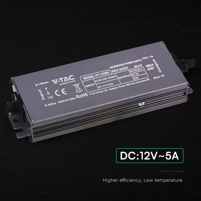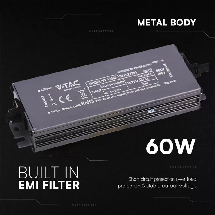 V-TAC LED Fémházas szerelhető vízálló tápegység 60W 5A 12V IP67 - 24263