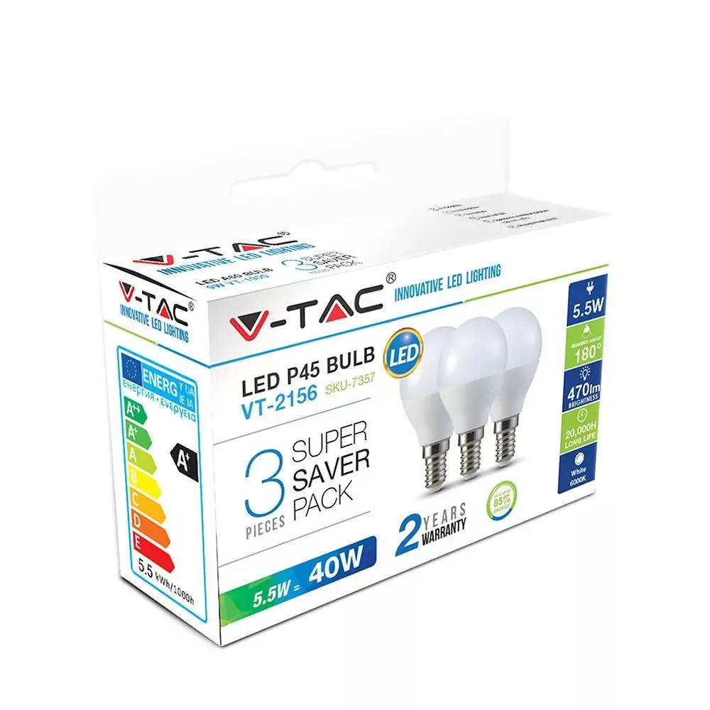 V-TAC LED izzó csomag (3 db) E14 P45 4.5W 180° 4000K kisgömb - 217358