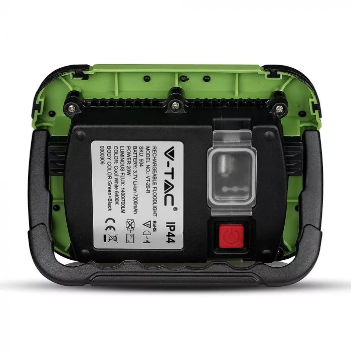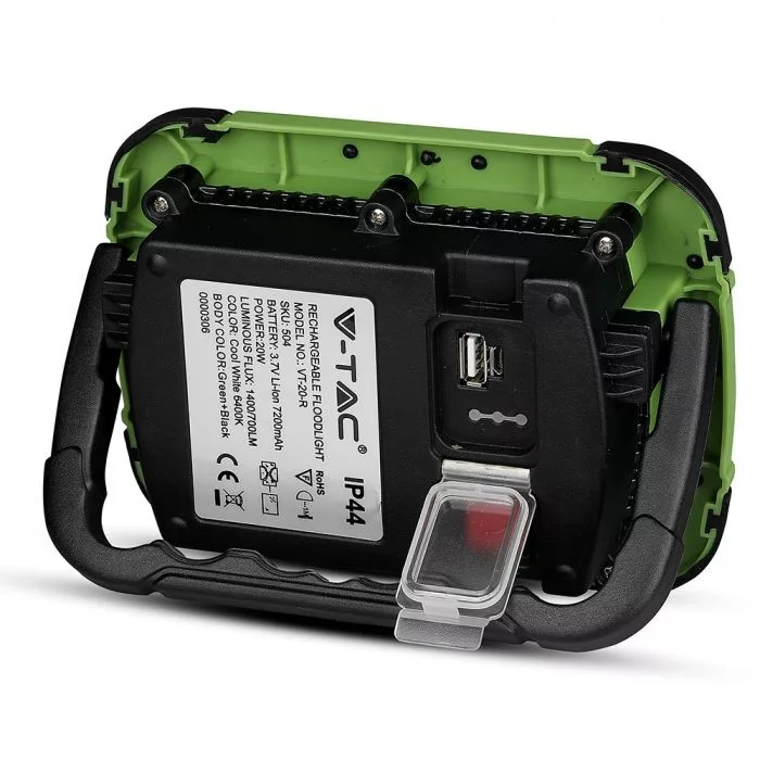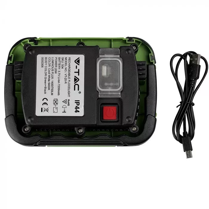 V-TAC LED tölthető, hordozható reflektor USB aljzattal, SOS funkcióval 20W 100° 4000K zöld, fekete házas (Samsung Chip) - 20039