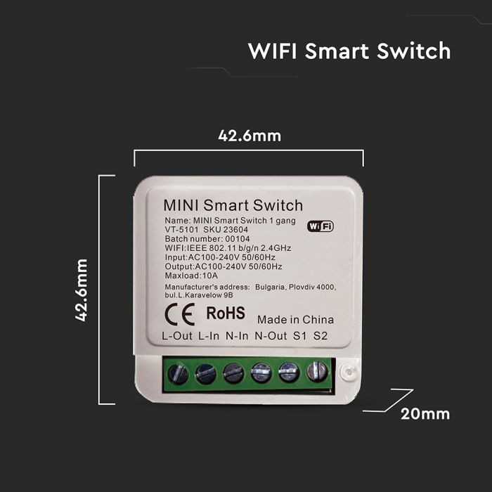 V-TAC MINI Online kapcsoló 1 gang, Amazon Alexa & Google Home kompatibilis - 23604