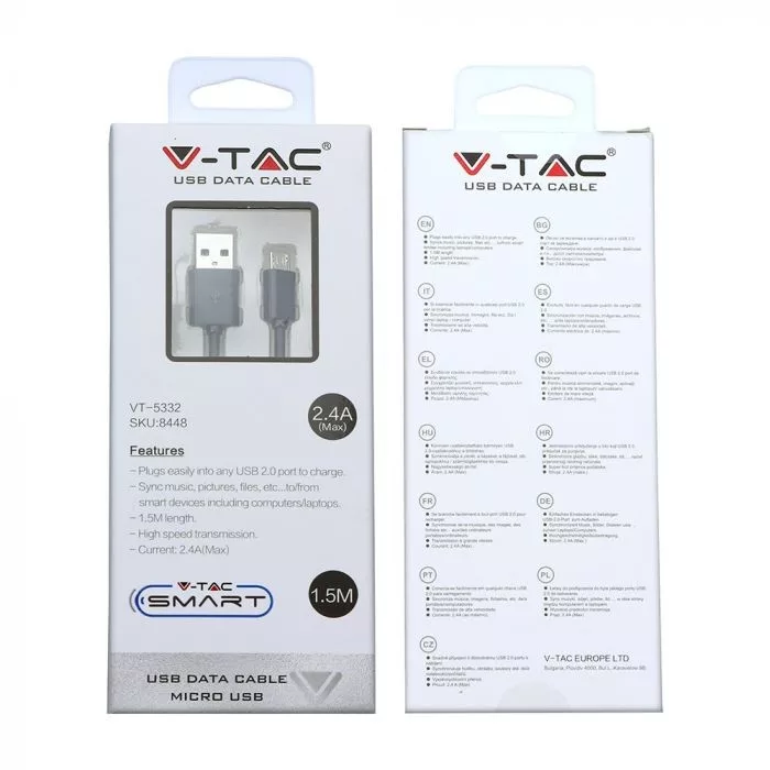 V-TAC Micro USB kábel 1,5m fekete - 8448