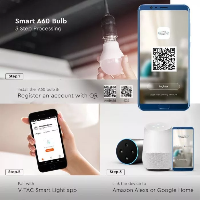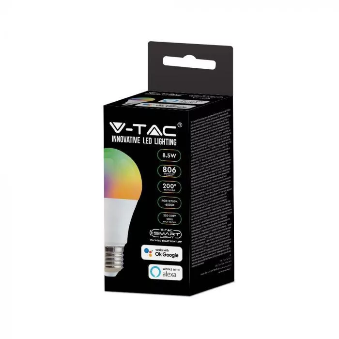 V-TAC Wifis smart LED izzó E27 A60 8.5W 200° RGB + 3 az 1-ben (CCT) gömb - 2998