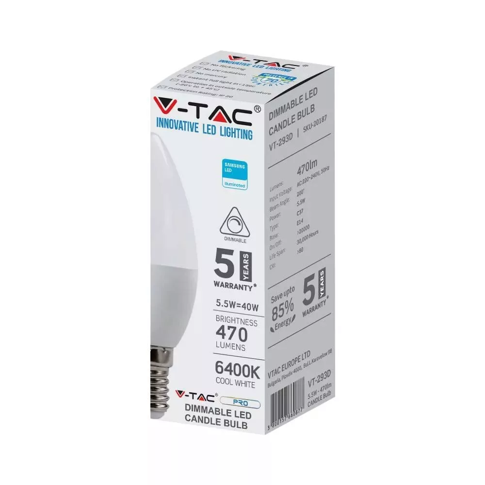 V-TAC LED izzó dimmelhető E14 C37 5.5W 200° 4000K gyertya (Samsung Chip) - 2120186