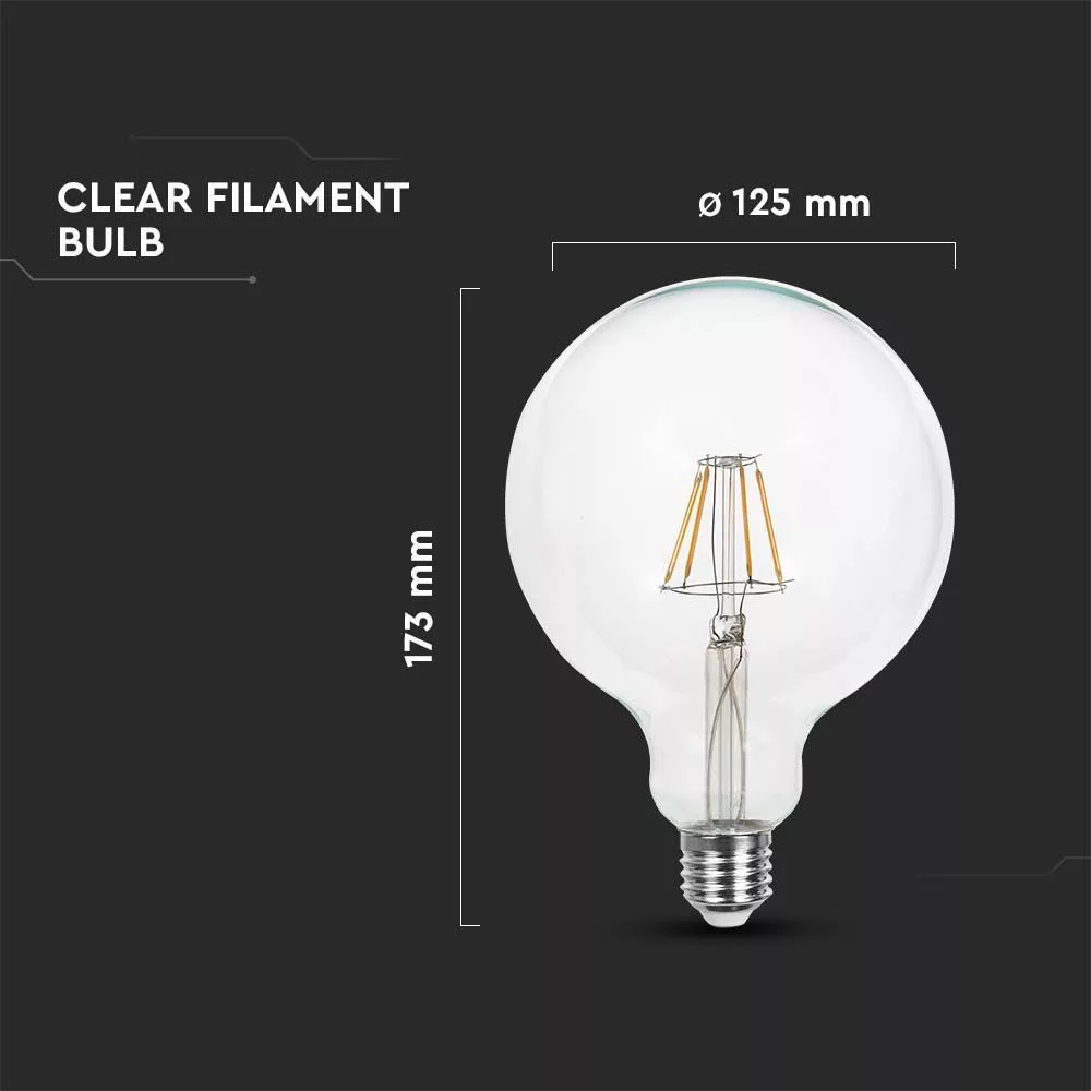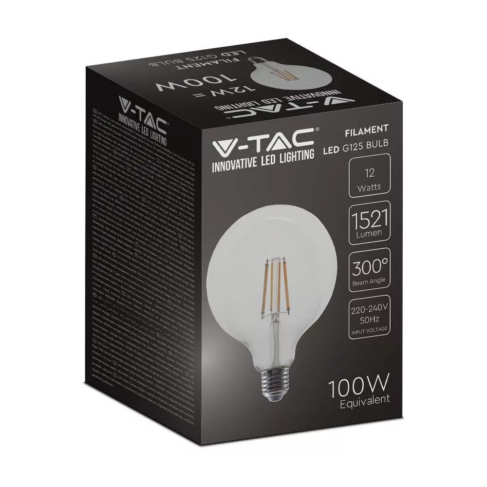 V-TAC Átlátszó LED izzó filament COG  E27 G125 12.5W 3000K nagygömb - 217453