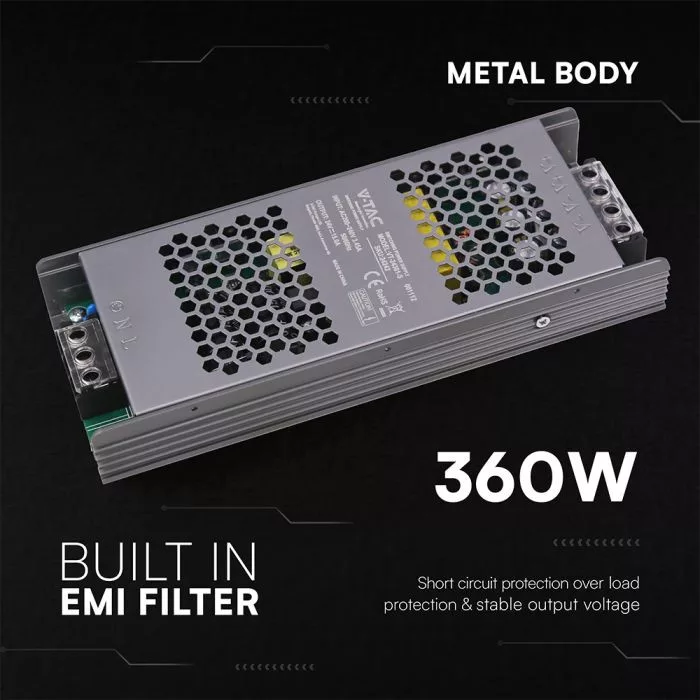 V-TAC LED Fémházas szerelhető SLIM tápegység 360W 15A 24V IP20 - 24242