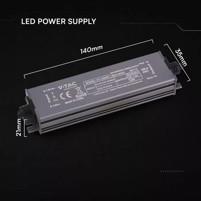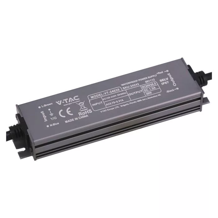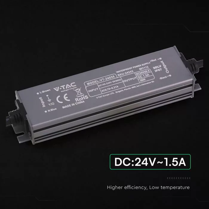 V-TAC LED Fémházas szerelhető vízálló tápegység 36W 1.5A 24V IP67 - 24243