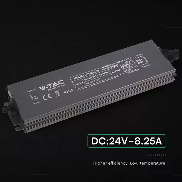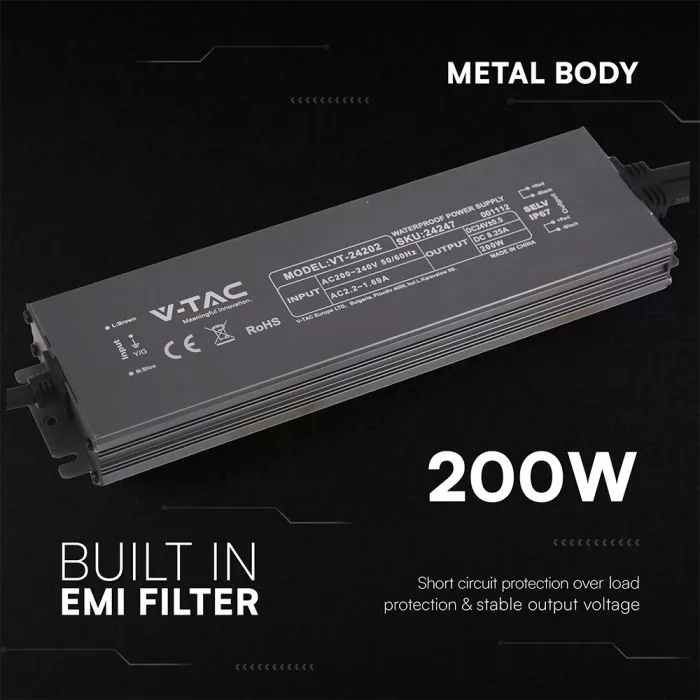 V-TAC LED Fémházas szerelhető vízálló tápegység 200W 8.25A 24V IP67 - 24247